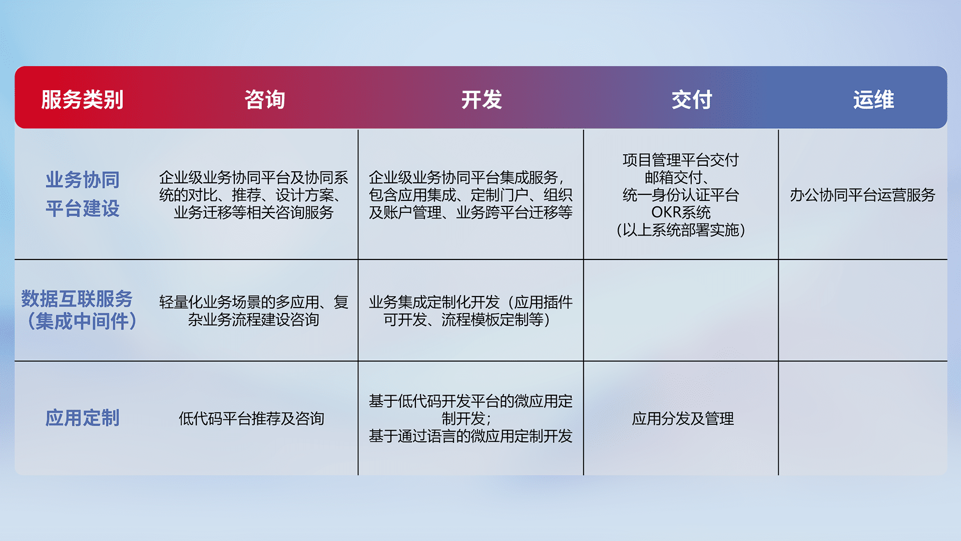 针对钉钉、、、、企微、、、、IDaas等平台级产品提供产品的规划、、、、方案、、、交付、、、、定制化开发等服务,,,,实现如统一协同办公、、、智能客户服务、、混合会议管理、、、、智能数据查询、、、等业务场景,,,实现数字化转型。。