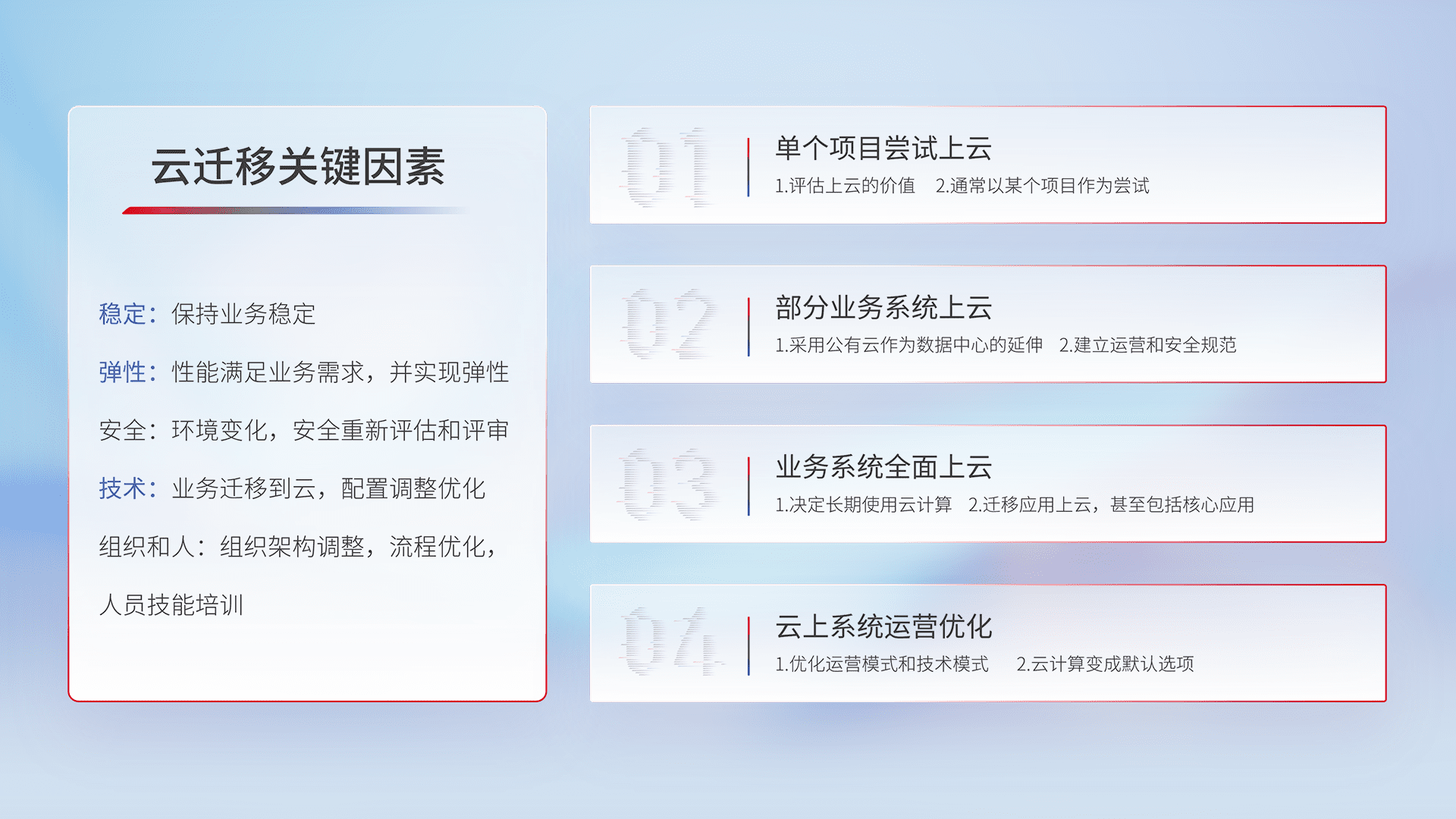 结合实际业务,,,,从规划设计、、、云平台选型、、云原生改造、、、、数据迁移、、、集成交付,,,迁移全过程为客户识别最佳上云路径,,,,做好风险识别管理,,,,设计网络架构、、身份权限、、、安全审计合规、、操作审计、、、、日志审计、、、监控告警策略、、、多站点容灾设计等,,,对云上基础设施进行整体规划,,,,提升IT治理水平,,以满足弹性、、、、高可用、、、、高性能的需求。。