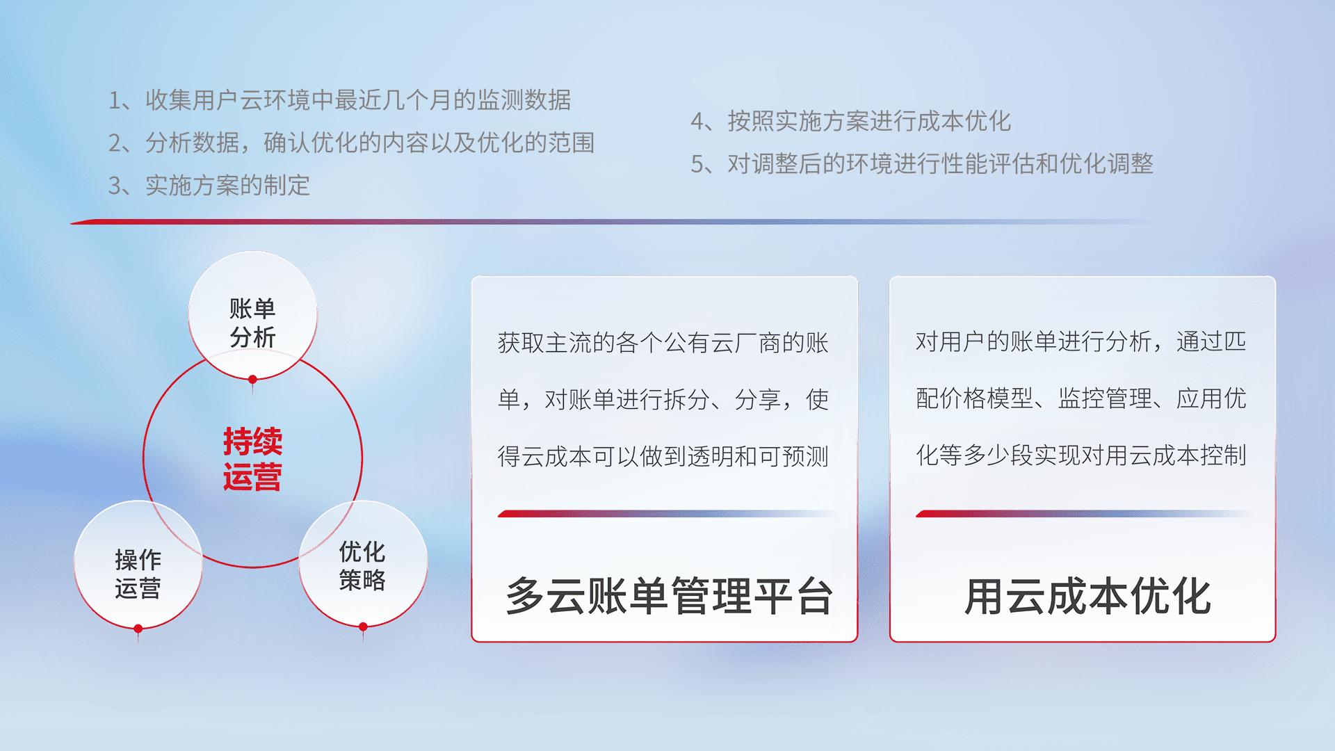 通过多云纳管,,,以统一的资源数据模型把客户的云资源进行抽象和封装,,进而实现对多云资源的统一操作,,,,保障云资源管理的可靠性、、、稳定性与可用性。。。。量身定制化运维内容,,,配置、、开发运维、、、补丁管理、、备份、、、监控、、认证和访问管理、、、、审计和日常巡检等,,,,保障在用云过程中的可靠度,,稳定度以及高可用率。。。。