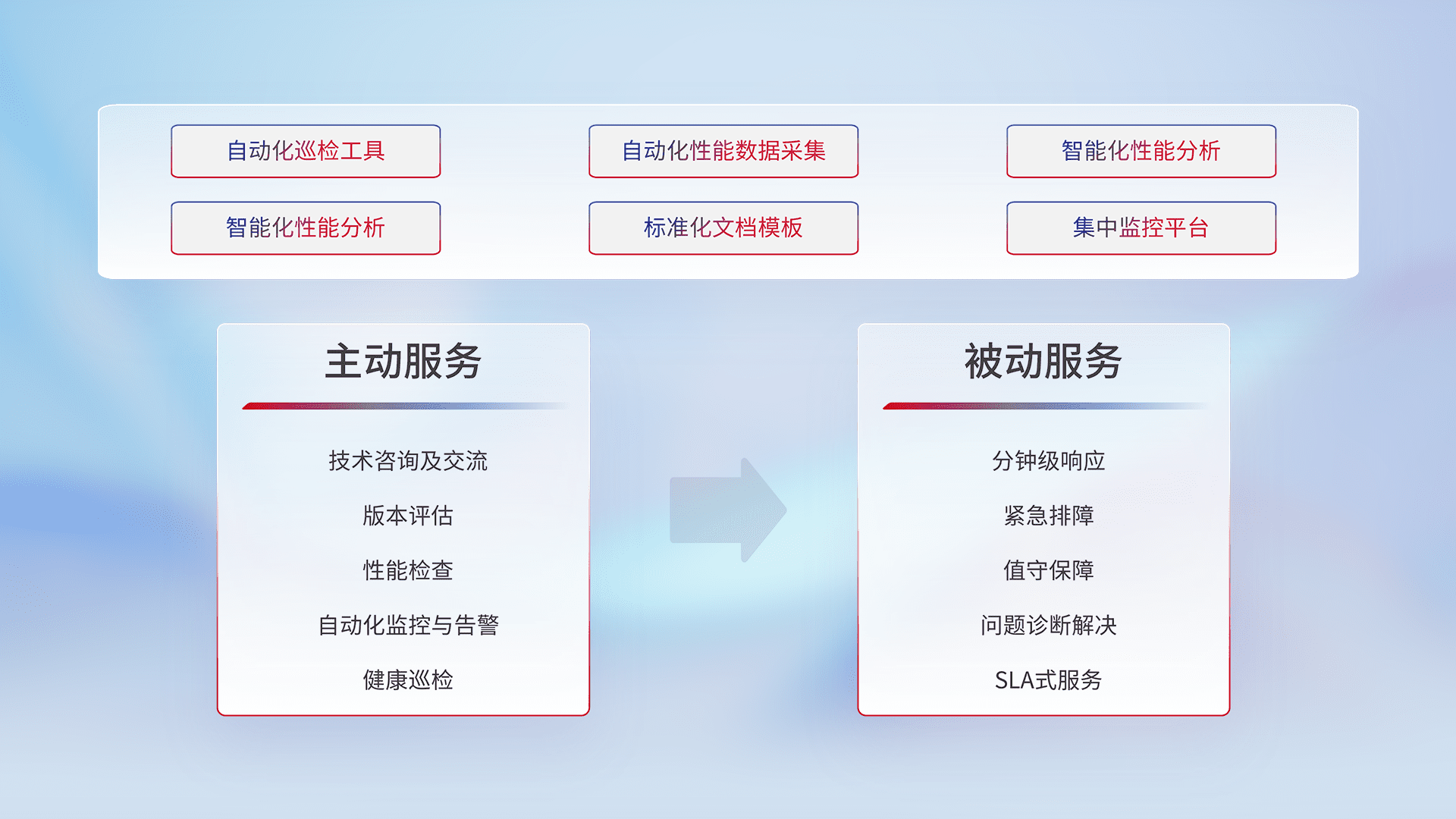 智能化工具和标准化文档,,,,保障服务质量,,,提供主动服务(包含技术咨询、、版本评估、、、性能检查、、自动化监控与告警、、、、健康巡检)和被动服务包含(分钟级响应、、、紧急排障、、、值守保障、、、问题诊断解决、、、、SLA服务)。。